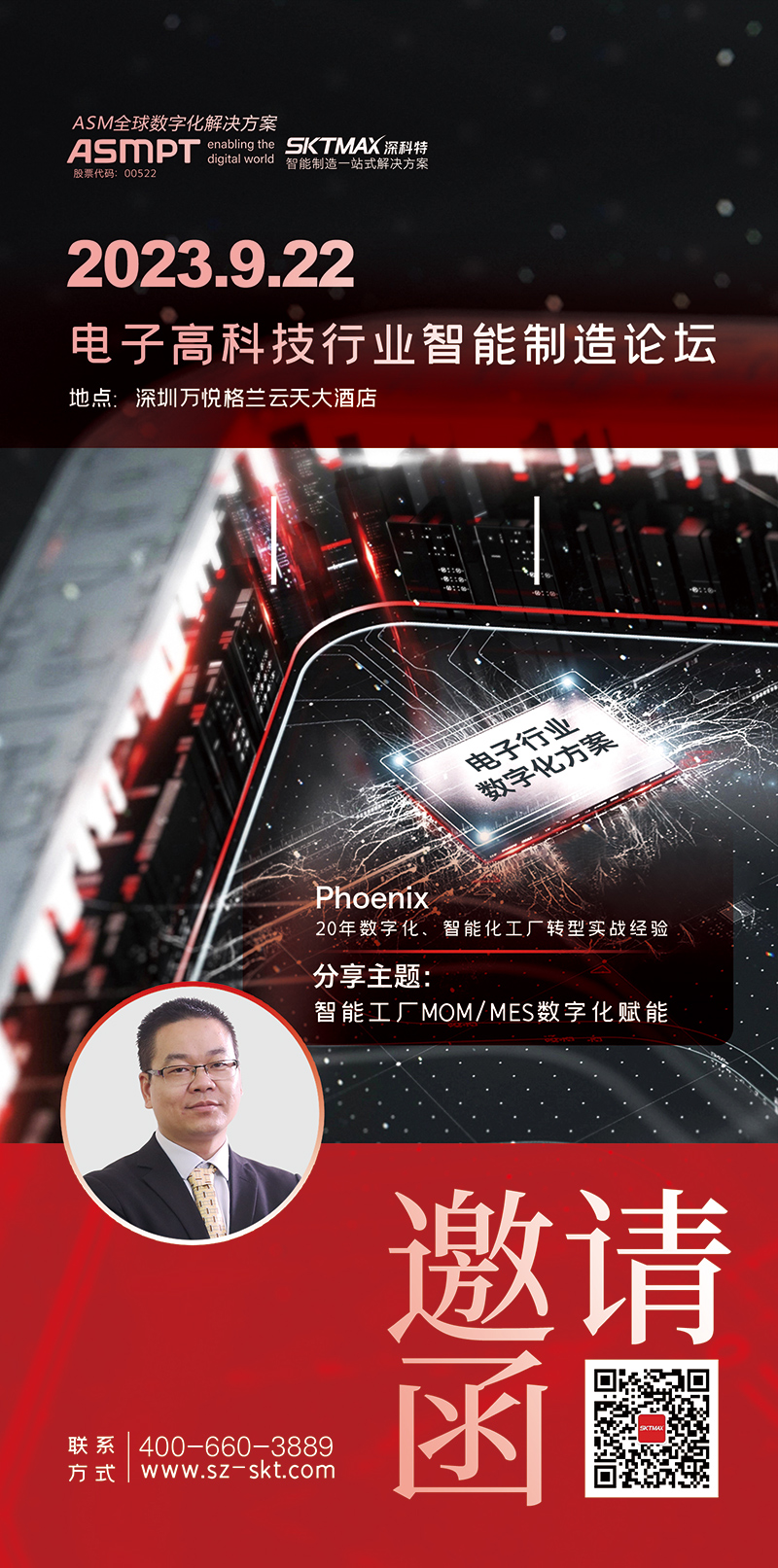 SKT 將出席定于2023年9月22日在廣東省深圳市萬悅格蘭云天酒店舉行的“2023 電子高科技行業智能制造論壇”。將為大家帶來電子科技行業MOM/MES成熟解決方案及案例剖析。精彩論壇,不可錯過!誠摯邀請您在百忙之中,撥冗出席!